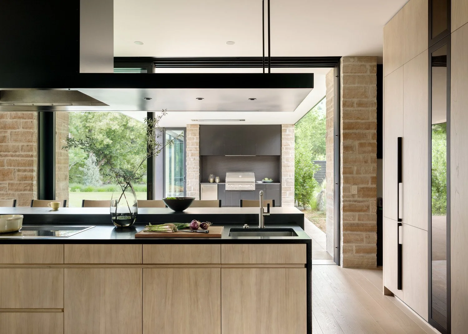 Two long linear forms are used in this design, angled at the site to create a large backyard with a sunken exterior living room and pool. The second floor, which houses the kids and guest bedrooms, crosses the lower level, creating a bridge and portal entry to welcome neighbors to the party while also serving as a covered outdoor dining area.